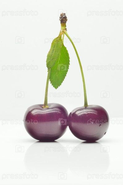 Вишня с листьями на белом фоне, крупный план