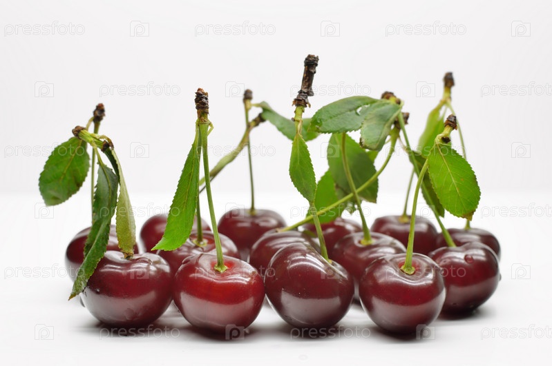 Вишня с листьями на белом фоне, крупный план