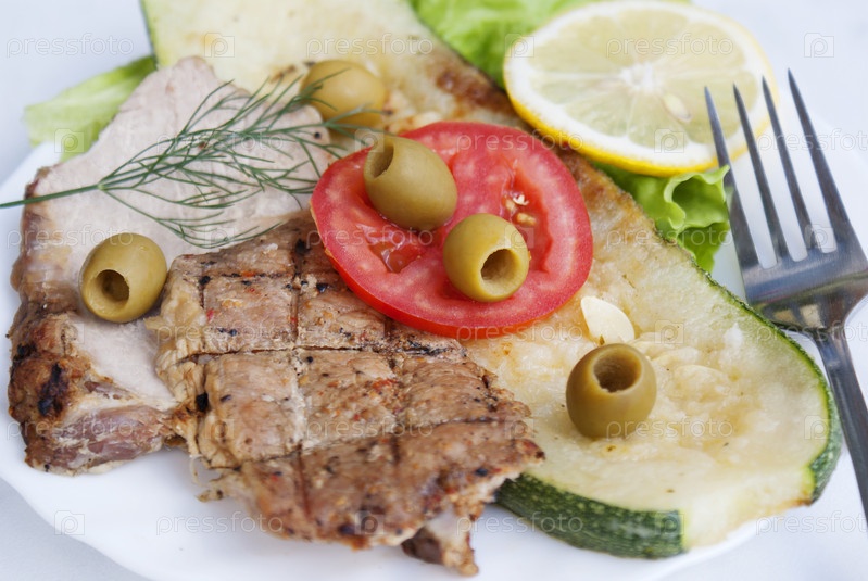 Креативное ресторанное блюдо из мяса и овощей с оливками