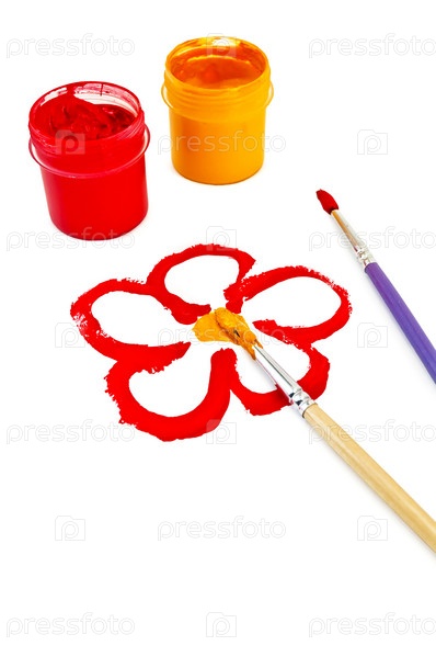 Цветок, нарисованный красной и желтой краской, две кисточки и две банки красной и желтой гуаши