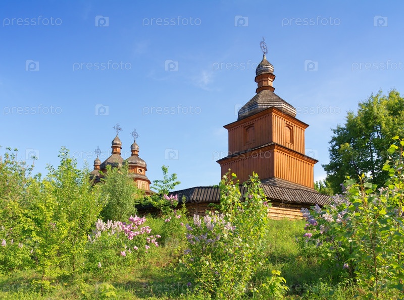 Весенний пейзаж с деревянной православной церковью