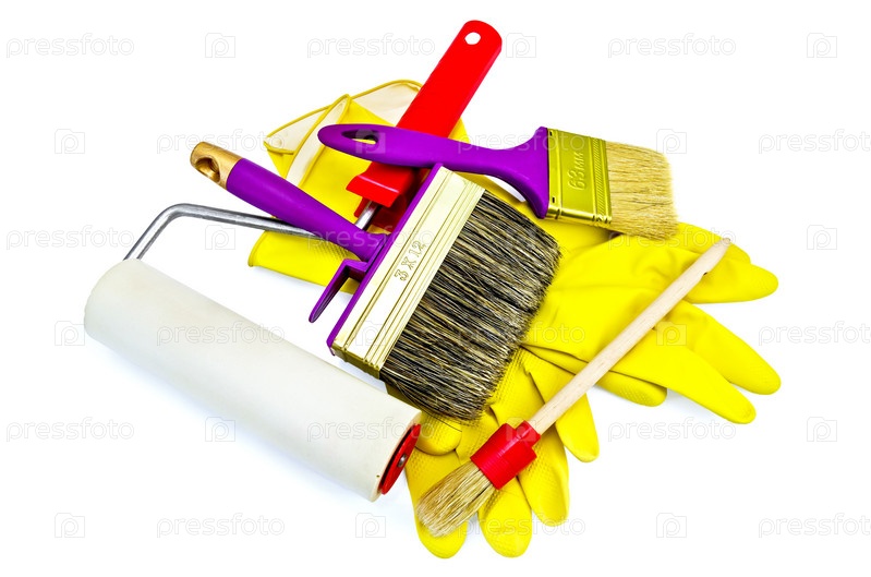 Кисти разного размера с желтыми перчатками и валиком на белом фоне