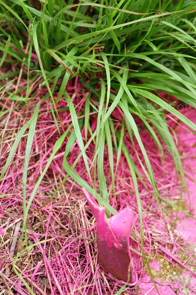 Зеленая трава и обрызганная розовой краской земля контрастируют между собой