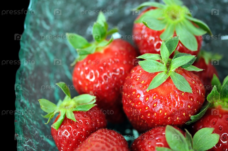 Стеклянная чаша со свежей клубникой на черном фоне. Выборочный фокус, крупный план