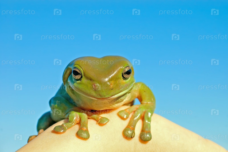 Большая старая зеленая древесная лягушка смотрит в камеру