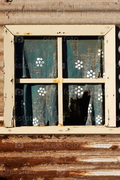 Стен старого заброшенного дома, обшитого железом, с разорванными занавесками на окне