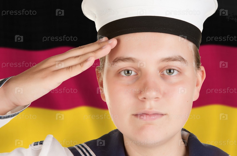 Женщина-матрос салютует на фоне немецкого флага