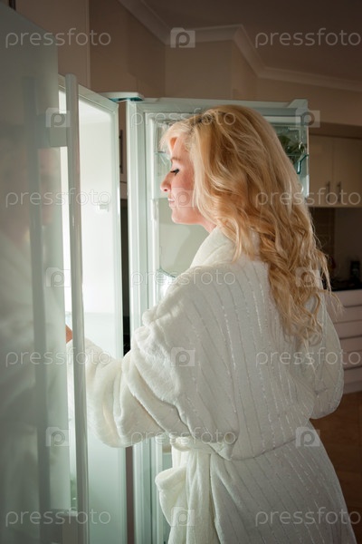 Молодая женщина заглядывает в холодильник для позднего перекуса