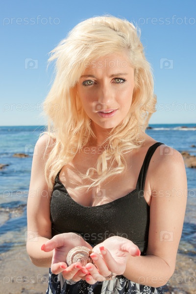 Красивая молодая женщина с ракушками на пляже