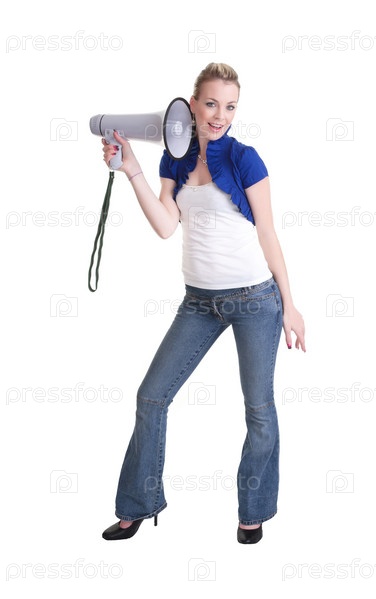 Молодая женщина с рупором, изолированная на белом фоне