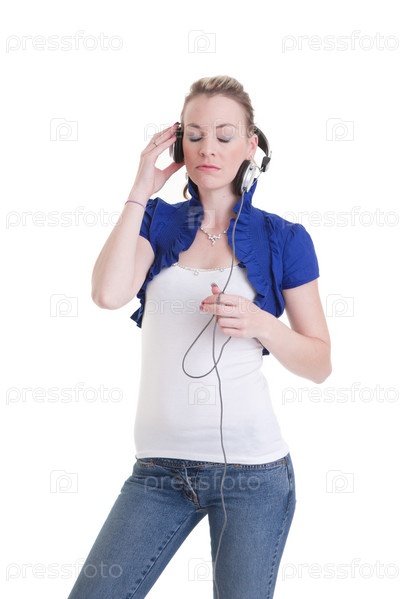 Привлекательная молодая женщина слушает музыку в наушниках, изолированная на белом