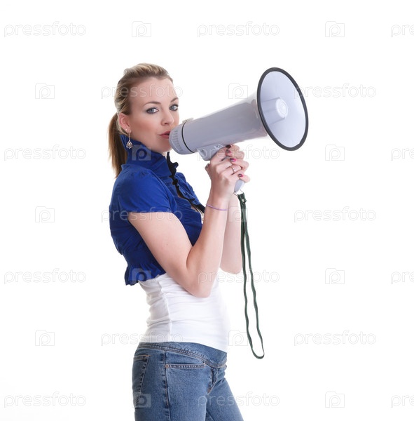 Молодая женщина с рупором, изолированная на белом фоне