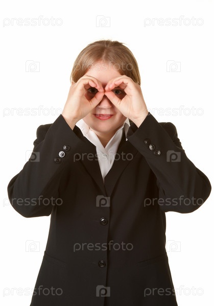 Деловаяс женщина смотрит в бинокль. сложенный из ладоней