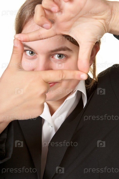 Деловая женщина смотрит сквозь рамку из пальцев