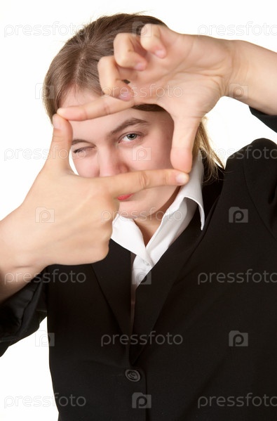 Деловая женщина смотрит сквозь рамку из пальцев