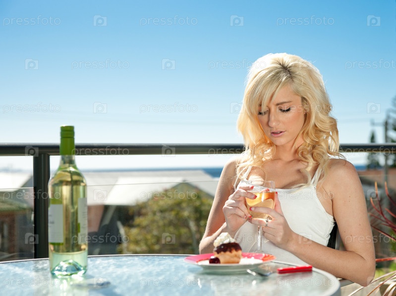 Молодая женщина пьет вино и ест десерт в кафе