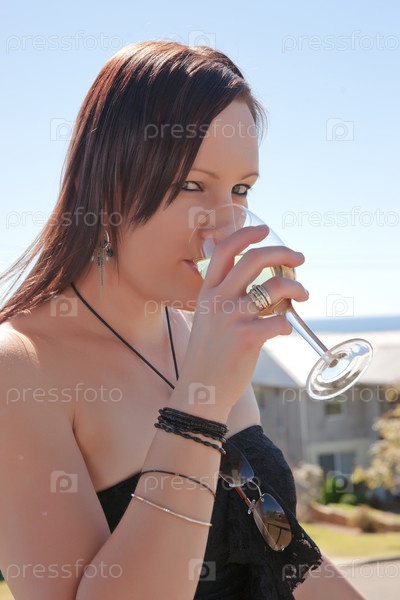 Молодая женщина с бокалом вина в ресторане или кафе на открытом воздухе