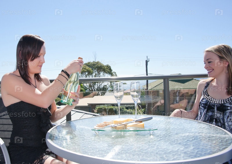 Молодые женщины с сыром и шампанским в ресторане или кафе на открытом воздухе