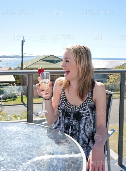 Молодая женщина с бокалом шампанского в ресторане или кафе на открытом воздухе