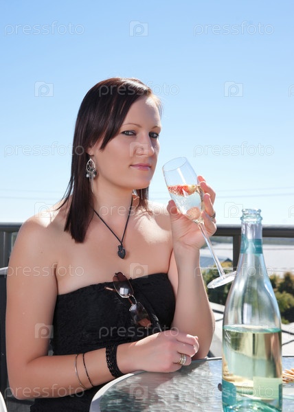 Молодая женщина с бокалом шампанского в ресторане или кафе на открытом воздухе