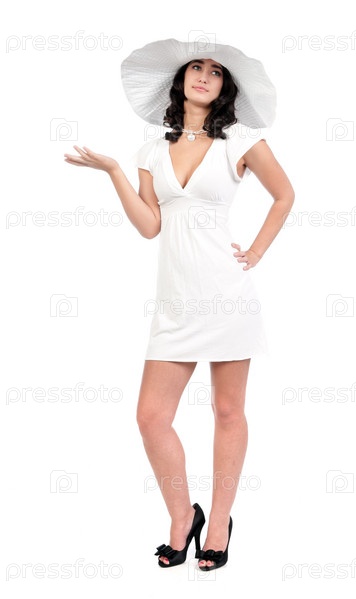 Красивая молодая женщина в белом платье и шляпе