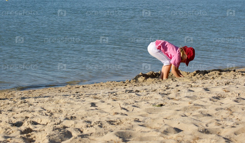 Девочка играет с песком на пляже