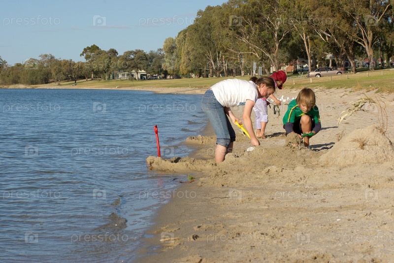 Дети строят замок из песка на пляже