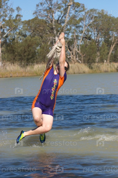 Девочка-подросток раскачивается на веревке над рекой
