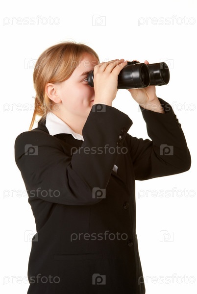 Молодая бизнес-леди с биноклем изолирована на белом флоне