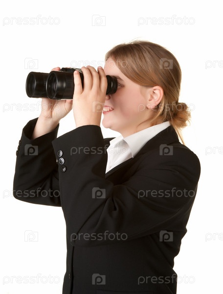 Молодая бизнес-леди с биноклем изолирована на белом флоне