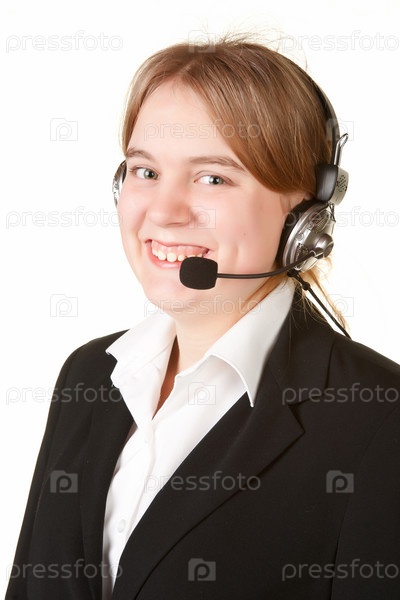 Молодая бизнес-леди с гарнитурой изолирована на белом флоне
