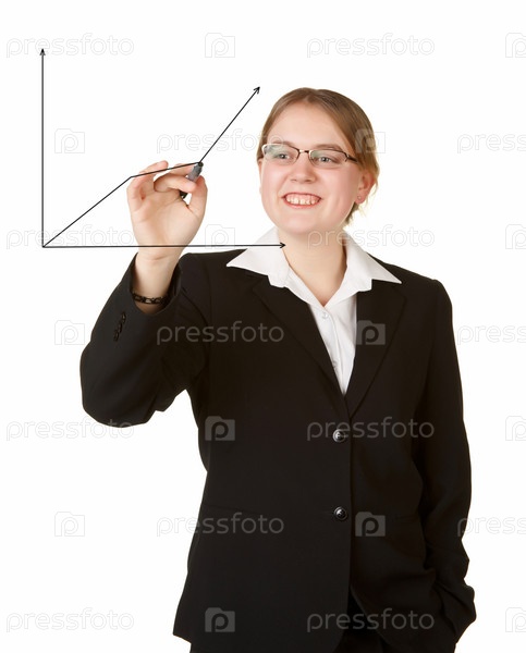 Молодая бизнес-леди рисует график, изолированная на белом флоне