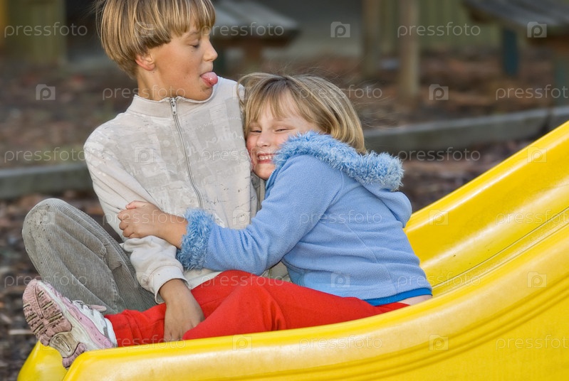 Мальчик и девочка или брат и сестра сидят на детской площадке