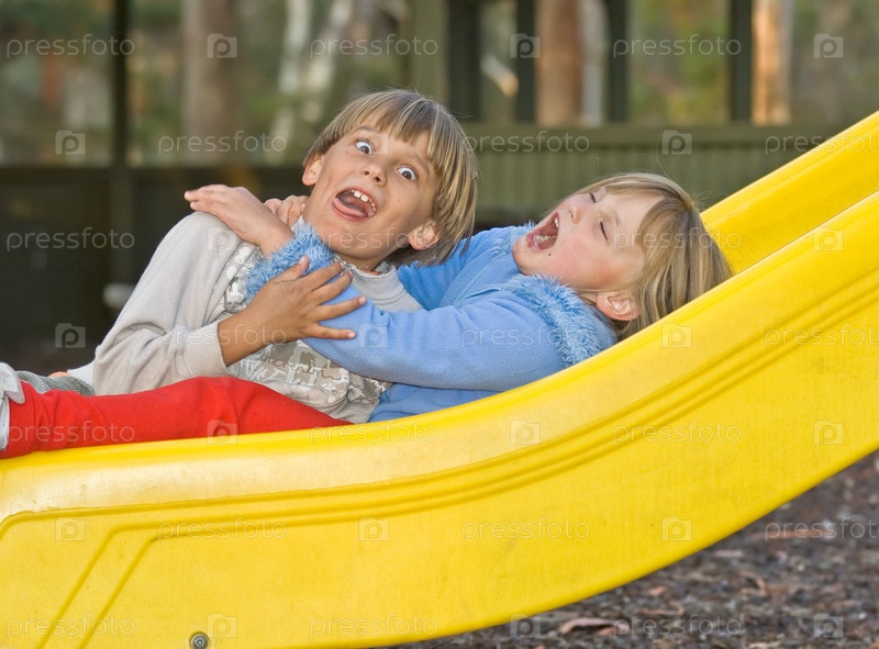 Мальчик и девочка или брат и сестра сидят на детской площадке