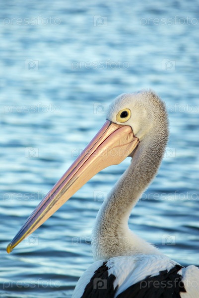 Пеликан на фоне голубой воды