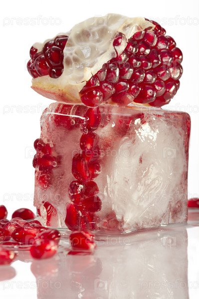 Зерна граната в кусочке льда на белом фоне