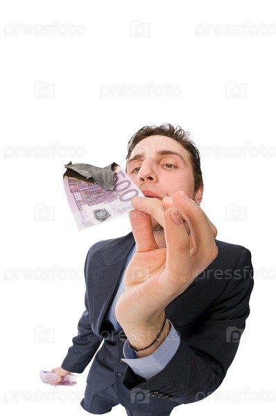 Бизнесмен рассматривает горевшую купюру на белом фоне