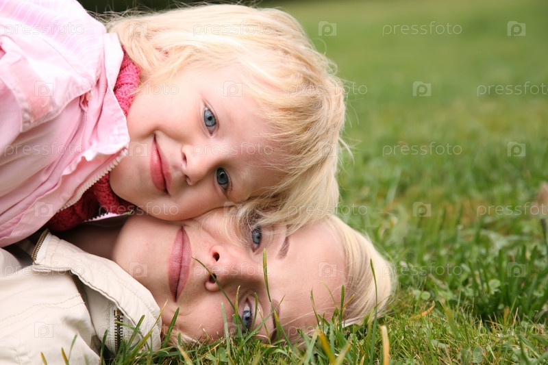 Мать и дочь лежат на траве