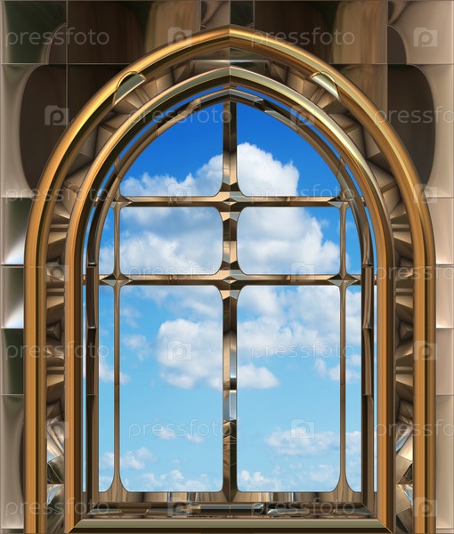 Окно в готическом или фантазийном стиле с видом на облачное голубое небо