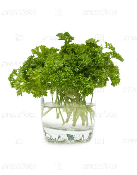 Зелень петрушки в стакане с водой на белом фоне