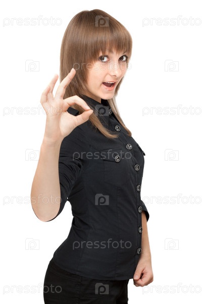 Молодая девушка в черной блузке показывает знак на белом фоне