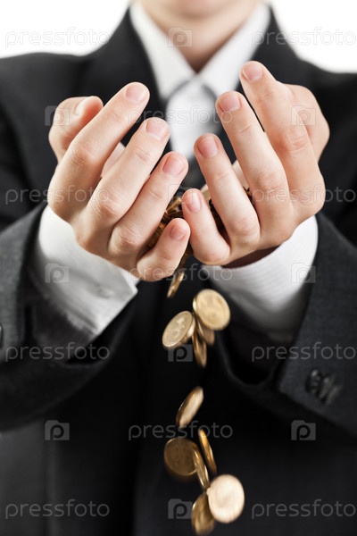 Деловой человек держит монеты в ладонях