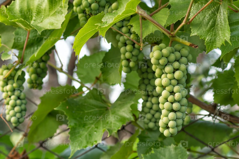 Гроздь незрелого винограда и листья в лучах утреннего солнца