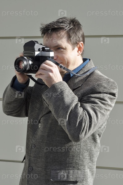 Фотограф делает моментальный снимок старой фотокамерой