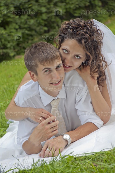 Счастливые молодожены лежат на траве