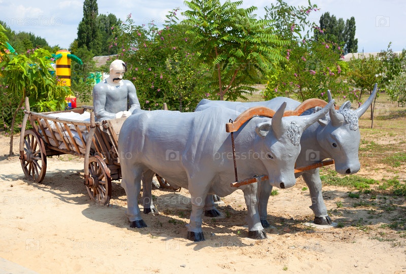 Памятник украинскому казацку в повозке, запряженной быками