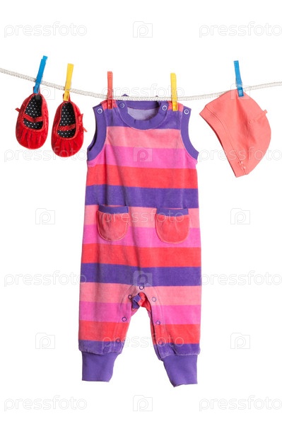 Набор детской одежды висит на веревках на белом фоне