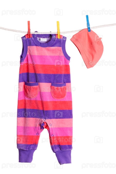 Набор детской одежды висит на веревках на белом фоне