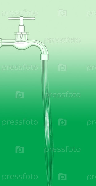 Вода льется из водопроводного крана на зеленом фоне