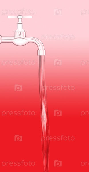 Вода льется из водопроводного крана на красном фоне